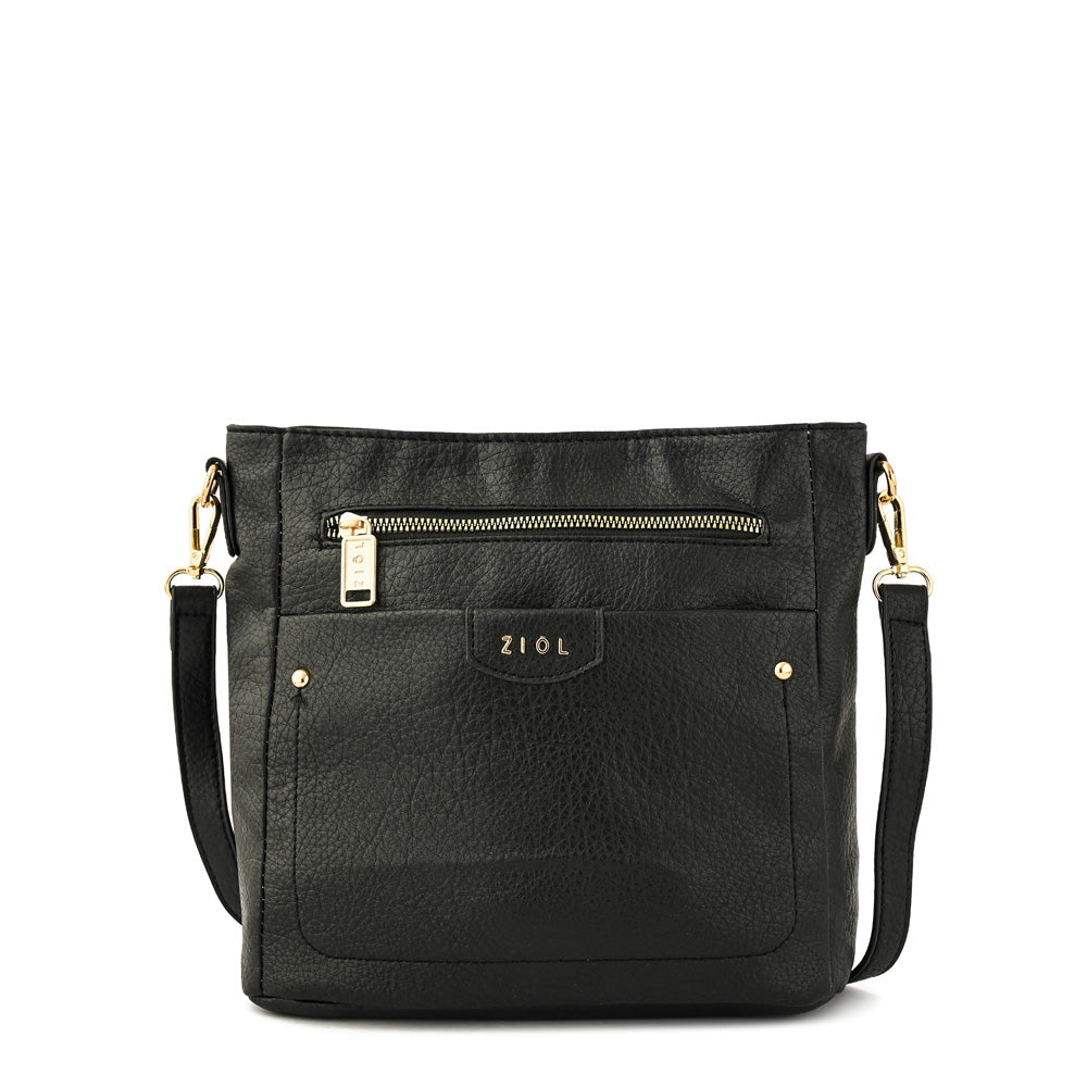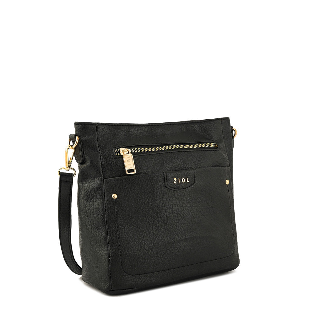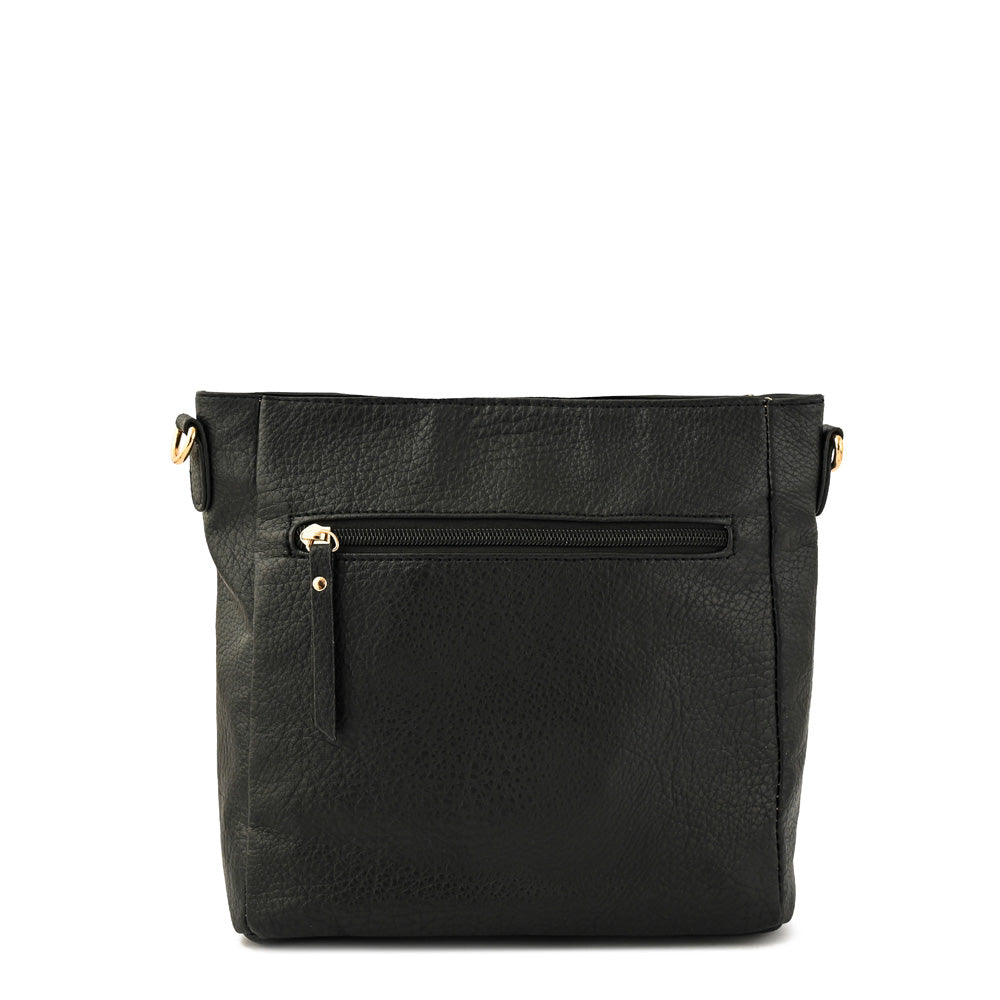 Bandolera mediana con textura pu grano y acabado metal dorado claro en color negro. Medidas: alto 23 cm x ancho 27 cm x fuelle 12 cm x.